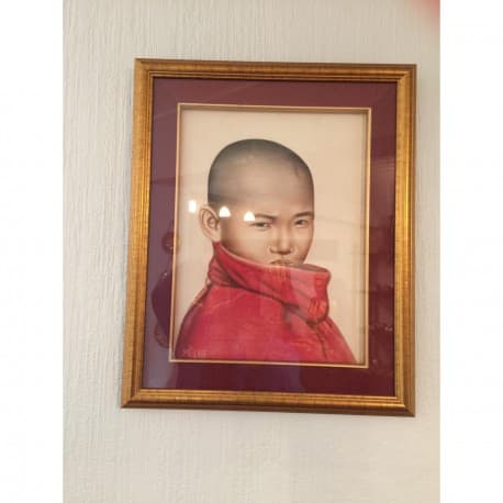 Maleri af en ung munk. Fra Burma bag glas og i forgyldt ramme. Signeret.
