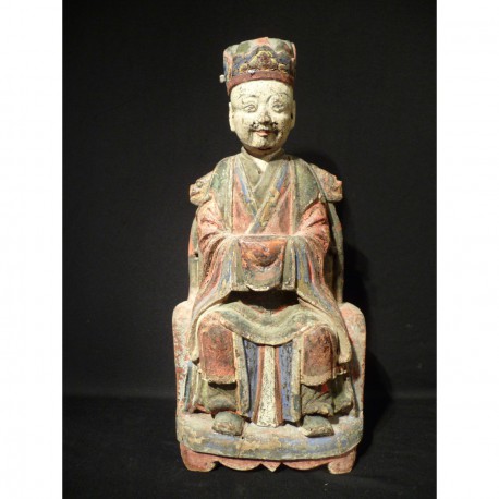 Flot og karakterfuld kinesisk bygud udført i træ og dateret til 1800-tallet, med bevaret original bemaling.