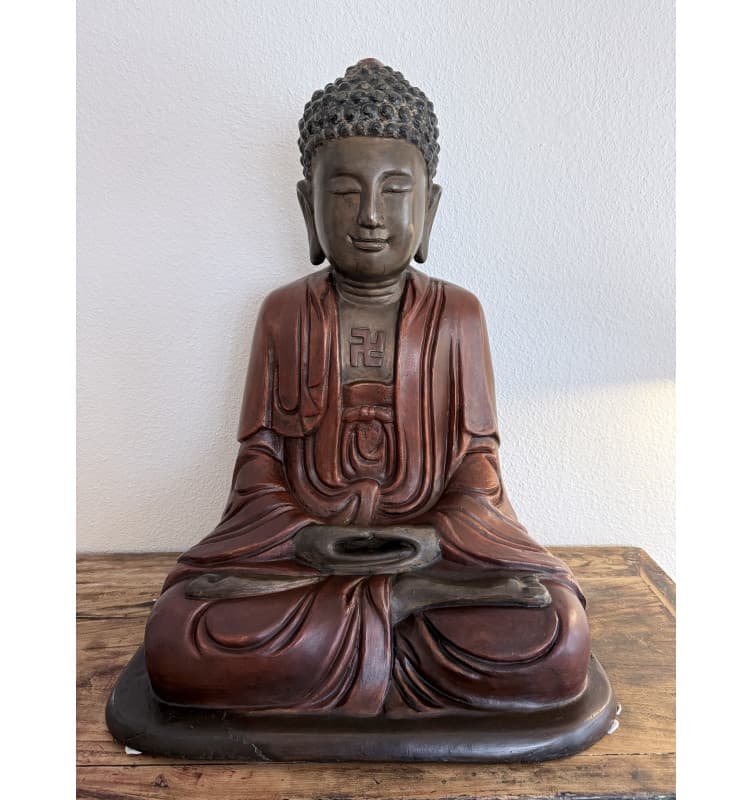 En uhyre smuk stor bronze Buddha i meget fin stand. Nyligt fået opfrisket lak beklædningen af konservator. Med det urgamle Svastika korset på brystet, menes at bidrage til held og lykke.