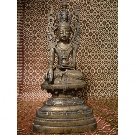 Denne antik Buddha statue i bronze er placeret på en elegant trone og udført med stor præcision i både proportioner og detaljer.
