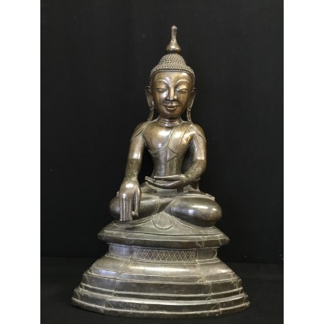 Meget smuk Shan bronze Buddha fra Burma. Uhyre klassisk på den store flerdelte trone. Den store usnisa (flamme på toppen af hovedet) som er stupa lignende. Håret er små pepperkorn; ørerne går ned til skuldrene; ansigtet ovalt og afstanden mellem øjenbryn og øjne er betragtelig. Bred næse; let smilende mund. Fremstillet i høj kvalitet og fremstår nu med en lækker brunlig patina. I meget god stand. Samlerstykke.