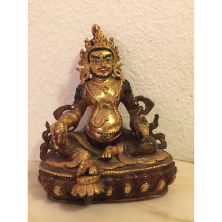 Jambhala, Gud for velstand, siddende på lotus trone med en rotte i sin venstre hånd. Håndmalet ansigt. Indlagte stene. Fint eksemplar. Lukket med en kobberplade i bunden med mærke.