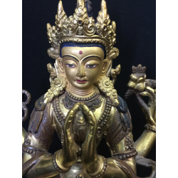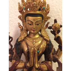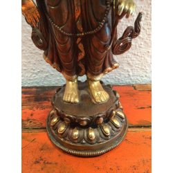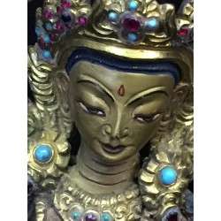 2.800,00 kr.Smuk Bodhisatwa Awalokiteswara eller Kharachheri på stor lotus trone i perfekt stand. Udført meget præcist med dekorationer overalt og håndmalet forgyldt ansigt. Indlagte stene. Lukket af i bunden med kobber plade med mærke.