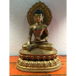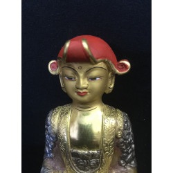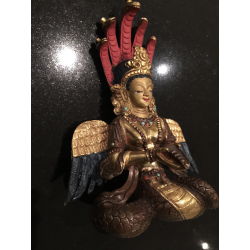 3.120,00 kr.Uhyre smuk og forholdsvis sjælden Manjushri Buddha på lotus trone i perfekt stand. Udført meget præcist med dekorationer overalt og håndmalet forgyldt ansigt. Indlagte stene og koraller. Afhængig af den Buddhistiske retning står Manjushri Buddhaen bla. for den fuldt oplyste Buddha og Budddhaen for meditation. Han står også for visdom og via sværdet vil han bekæmpe bla uvidenhed.