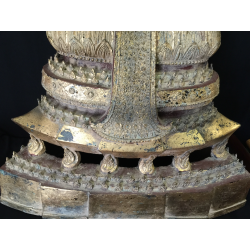 8.400,00 kr.Større siddende forgyldt Bangkok Buddha på meget stor flerdelt og gennembrudt trone. Rigt udsmykket og med et fint udtryk. I meget fin stand.