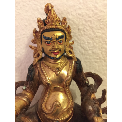 2.320,00 kr.Jambhala, Gud for velstand, siddende på lotus trone med en rotte i sin venstre hånd. Håndmalet ansigt. Indlagte stene. Fint eksemplar. Lukket med en kobberplade i bunden med mærke.