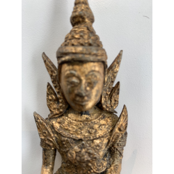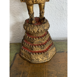 2.240,00 kr.Smuk stående Bangkok Buddha på flerdelt lotustrone. Delvist forgyldt og med rester af flusser på roben. Stående i en "holder oversvømmelser tilbage" eller "velsigne" positur. Ganske velbevaret.