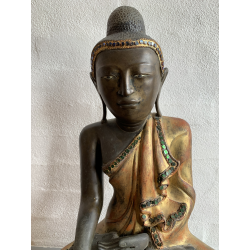 12.000,00 kr.En virkelig lækker klassisk Mandalay Buddha; siddende på base af træ. Hans forgyldte klædedragt er udsmykket med indlagte stene, forrest en inskription. I meget fin stand.