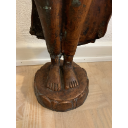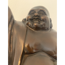 14.400,00 kr.Sjælden større stående happy Buddha i en brunlig mørk bronze. Dejligt udtryk og i en meget god stand. På en træstand (21x25x5 cm)