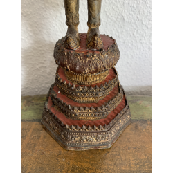 2.240,00 kr.Smuk stående Bangkok Buddha på flerdelt lotustrone. Delvist forgyldt og med rester af flusser på roben. Stående i en "holder oversvømmelser tilbage" eller "velsigne" positur. Holder til paraply, fødder og huller i basen er repareret, men ellers er Buddhaen faktisk i meget god tilstand, bla. med mange sten flusser og toppen velbevaret.
