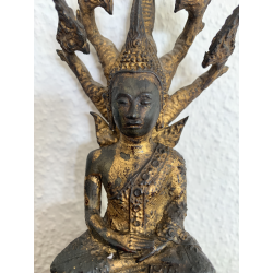 3.920,00 kr.Sjælden fin mindre siddende Naga (slange) Buddha med delvis forgyldning. I god stand med kun et lille hul i basen. Bangkok periode.