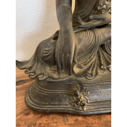 20.000,00 kr.Sjælden og uhyre smuk og stor Mandalay bronze Buddha. Siddende i "calling earth to witness" positur i den meget udsmykkede robe. Øjnene er udført i perlemor. På basen ses en længere inskription og 2 små tilbedere. I super stand.