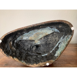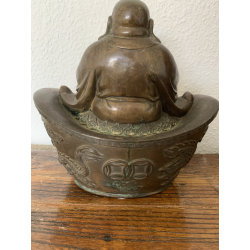 6.800,00 kr.Happy Buddha på muslingeskal trone udført i bronze. Fra Kina og ganske usædvanlig med skrifttegn på tronen og lukket bund. I meget god stand.