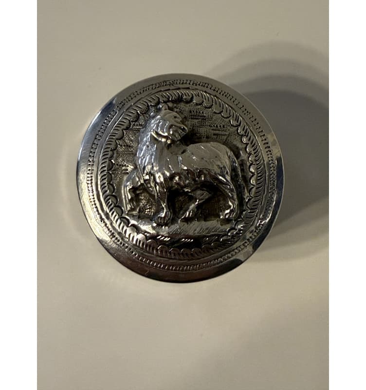 Mindre rund sølvdåse med et fabeldyr på låget. Blanke sider. I meget fin stand. Vægt: 39 gram.