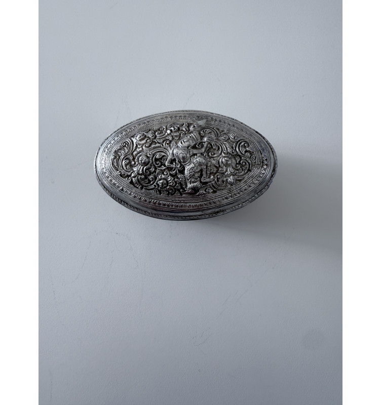 Smuk sølvdåse med en person på låget omgivet af blad/gren motiver. Blanke sider og bund. Brugsspor. Vægt 97 gram.