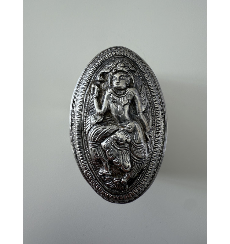 Solid smuk sølvdåse med en person på låget. Blanke sider og en inskription i bunden. Vægt 87 gram.
