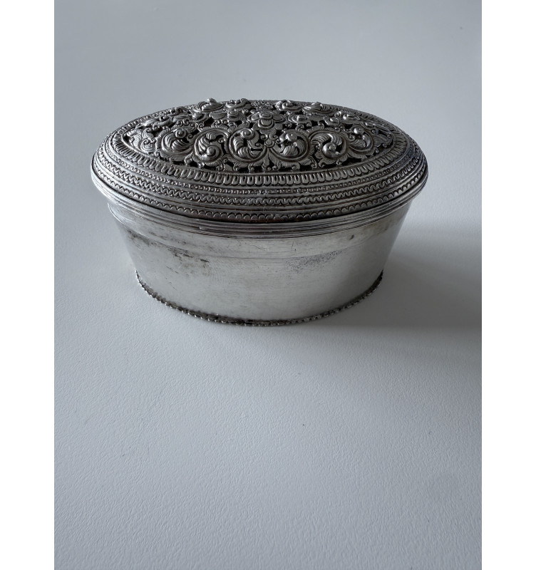 Oval sølvdåse med blomster mønster på låget. Blanke sider. Dåsen afsluttes med en riflet kant. I meget fin stand. Vægt 90 gram.