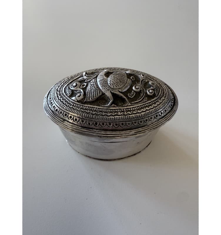 Solid smuk sølvdåse med en utrolig smuk påfugl på låget. Blanke sider og bund. I meget fin stand. Vægt 80 gram.