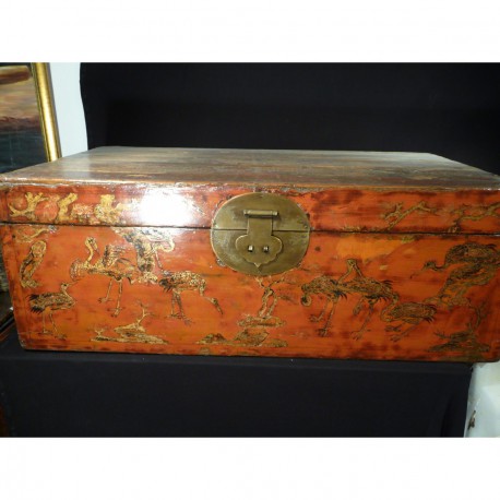 Større flot rød/orange kimino opbevaringskasse i fyr med lak. Scenarier af fugle på front. Original metallukning.