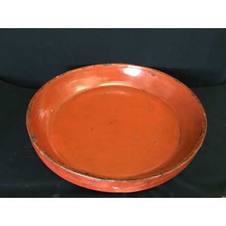 Rundt stort fad i rød lak.