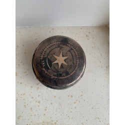 800,00 kr.Gammel opbevarings dåse for knust lime der bliver brugt i madlavning og i en blanding af tobak ala skrå. Med indlagt metal i låget og inskription i bunden. Disse dåser i kobber er uhyre svære at finde den dag i dag. Vægt 122 gram.