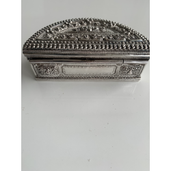 1.360,00 kr.Meget smuk håndlavet gennembrudt sølvboks med en royal person på låget. På siderne fugle og personer. Vægt 68 gram. Sjælden kvalitet og håndværk.