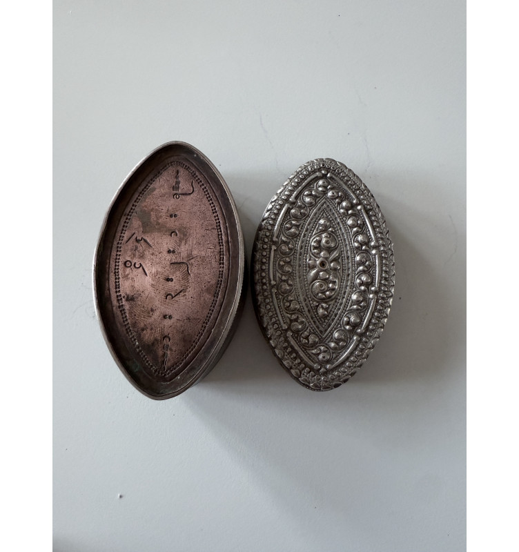 Meget sjælden kobber opbevarings dåse for knust lime der bliver brugt i madlavning og i en blanding af tobak ala skrå. Låget er udført i sølv og siderne i kobber. Dåsen afsluttes af et bånd af sølv. I bunden er der inskriptioner, datoer. Disse gamle dåser i kobber er uhyre svære at finde den dag i dag. Rester af lime. Vægt 73 gram.