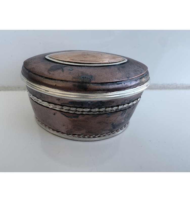 Yderst sjælden kobber lime dåse i meget høj kvalitet. Med sølv i bunden, siderne og låget. Rester af knust tørret lime. Vægt 122 gram. I fin stand.