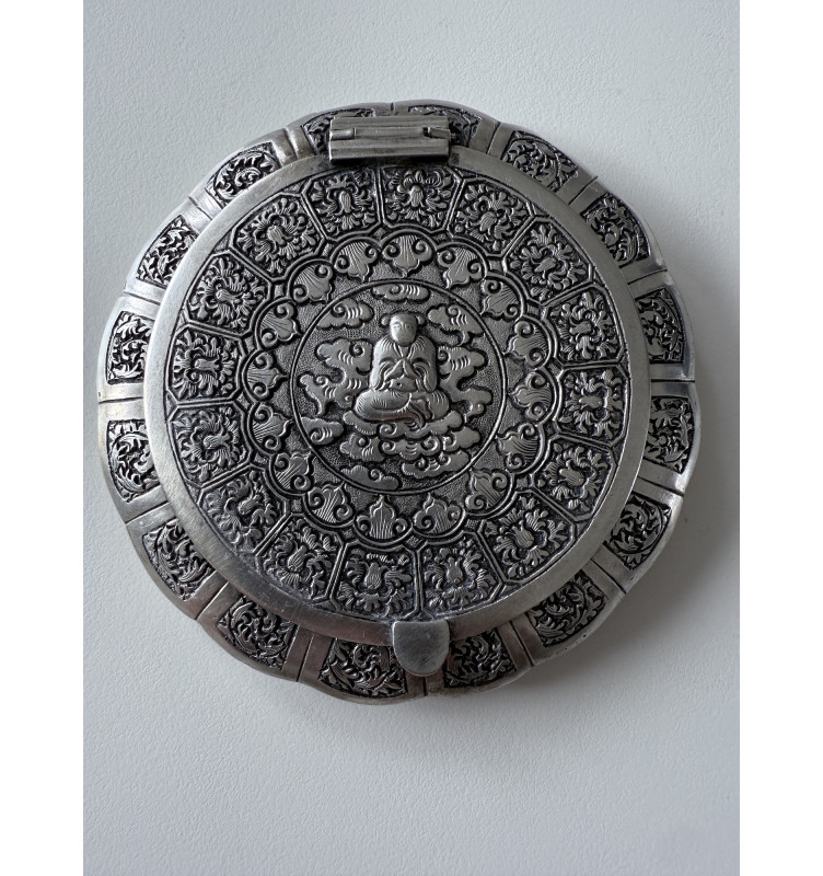 Unikt og meget smukt make up spejl udført i sølv. På bagesiden et meget udførligt blomster mønster, på fronten ses Buddha omgivet af diverse symmetriske mønstre. Vægt: 70 gram.