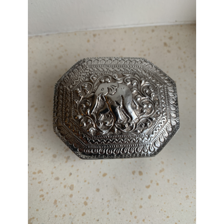 Smuk 8 kantet håndlavet sølvboks med en elefant på låget og et floralt motiv på siderne. I god stand. Vægt 52 gram.