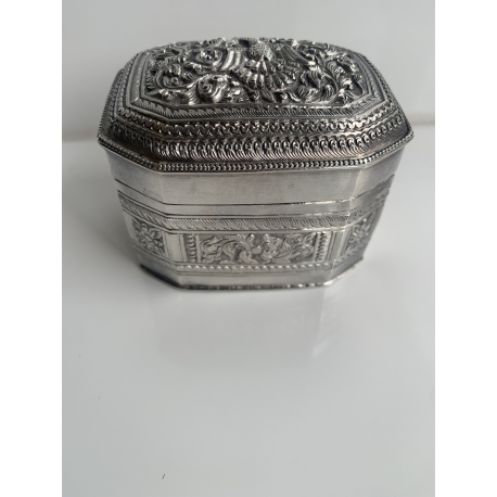 Fin håndlavet lime sølvboks med et floralt motiv på siderne og en påfugl på låget. I god stand. Vægt 127 gram.