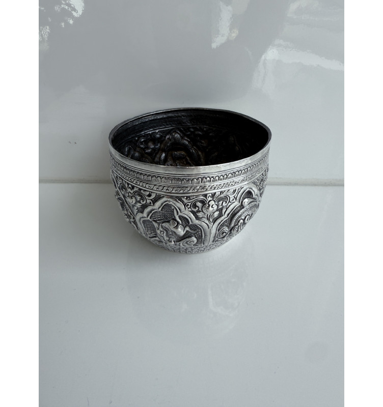 Ældre sølvskål præget med fabeldyr på siderne. I bunden ses et mærke. Meget spændende skål i god stand. Vægt 91 gram.