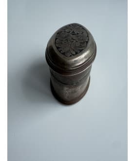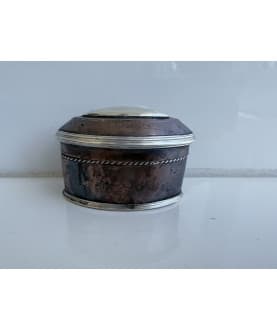 1.500,00 kr.Sjælden oval opbevarings dåse for knust lime der bliver brugt i madlavning og i en blanding af tobak ala skrå. Med indlagt sølv i låget i bunden og på siden. Disse dåser i kobber er uhyre svære at finde den dag i dag. Vægt 115 gram.
