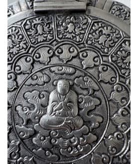 1.500,00 kr.Unikt og meget smukt make up spejl udført i sølv. På bagesiden et meget udførligt blomster mønster, på fronten ses Buddha omgivet af diverse symmetriske mønstre. Vægt: 70 gram.