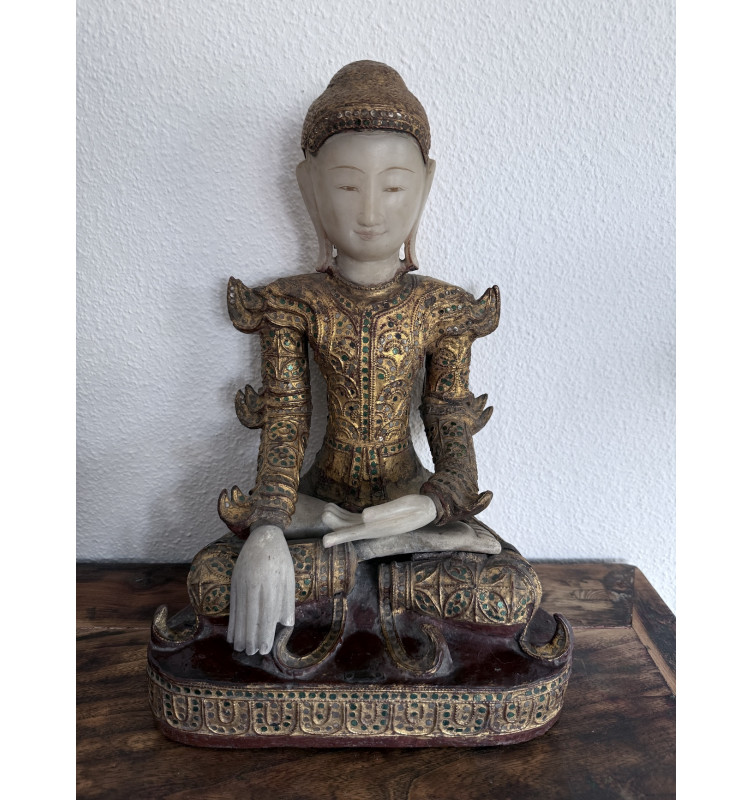 Sitting Mandalay Buddha on a wooden base. This type of Buddha is quit unique for Burmese Buddhas and is very rare and special. The Buddha is made of alabaster and wood with stone inlay. This Buddha, in red colors, has a serene face and you can see the age in the wear on his robe. In an overall very good condition.