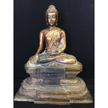 Seltener sitzender burmesischer Mon-Buddha auf einem großen Thron. Er hat eine scharfe Nase, die Augen sind niedergeschlagen und er trägt ein verziertes Gewand. Auf der Stirn befindet sich ein weißer Stein. Dieser Buddha sitzt auf einem sehr großen, schön dekorierten Thron mit einer kleinen Inschrift (sagt: Buddha ist Schatz von Yar Ma Nya = Mon) an der Seite. Schöne Patina ohne Farbreste. In sehr gutem Zustand.