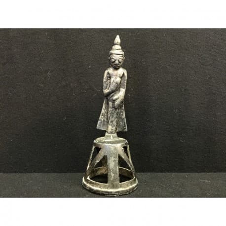 Kleine feine stehende Shan-Bronze-Buddha aus Birma. Dieser klassische Shan-Buddha steht auf einem großen durchbrochenen Thron. An der Spitze seines Kopfes erhebt sich eine große Usnisa (Flamme). Er trägt ein großes einfaches Gewand. Die Ohren reichen bis zu den Schultern hinunter.