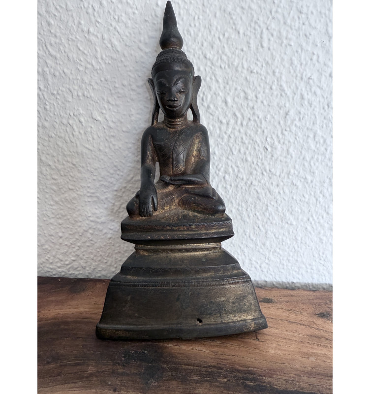 Schöner kleiner sitzender Bronze-Buddha aus Birma. Dieser klassische Shan-Buddha sitzt auf einem großen Thron in einer "die Erde als Zeugin rufen" Haltung. Sein ovales Gesicht hat einen gelassenen Ausdruck, das Haar ist pfefferkornartig gestylt und oben erhebt sich die usnisa (Flamme) in Form einer Stupa. Das Gewand ist einfach und bedeckt die linke Schulter, die Ohren reichen bis zu den Schultern. Reste von altem Gold. Der Buddha ist in einwandfreiem Zustand, der Thron hat ein kleines Loch an der Vorderseite.