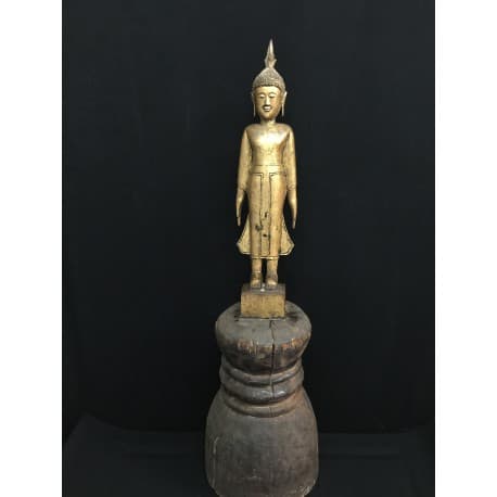 Sehr schöner stehender vergoldeter Buddha aus Laos. Dieser Buddha ist in sehr gutem Zustand. Auf einem ungewöhnlich großen Thron