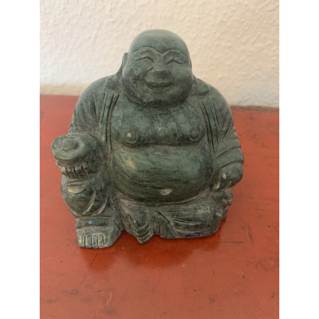 Größerer massiver Glücks-Buddha aus dunkelgrünem poliertem Jade/Jadeit. Gewicht ca. 840 Gramm. Intakt.