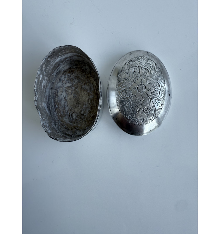 Silberne Limettenbox mit ungewöhnlicher Form. Ein schönes Blumenmuster ist in die Mitte des Deckels getrieben. Ein Datum oder Name ist in die Unterseite der Box getrieben. Leere Seiten. Gewicht 44 Gramm.