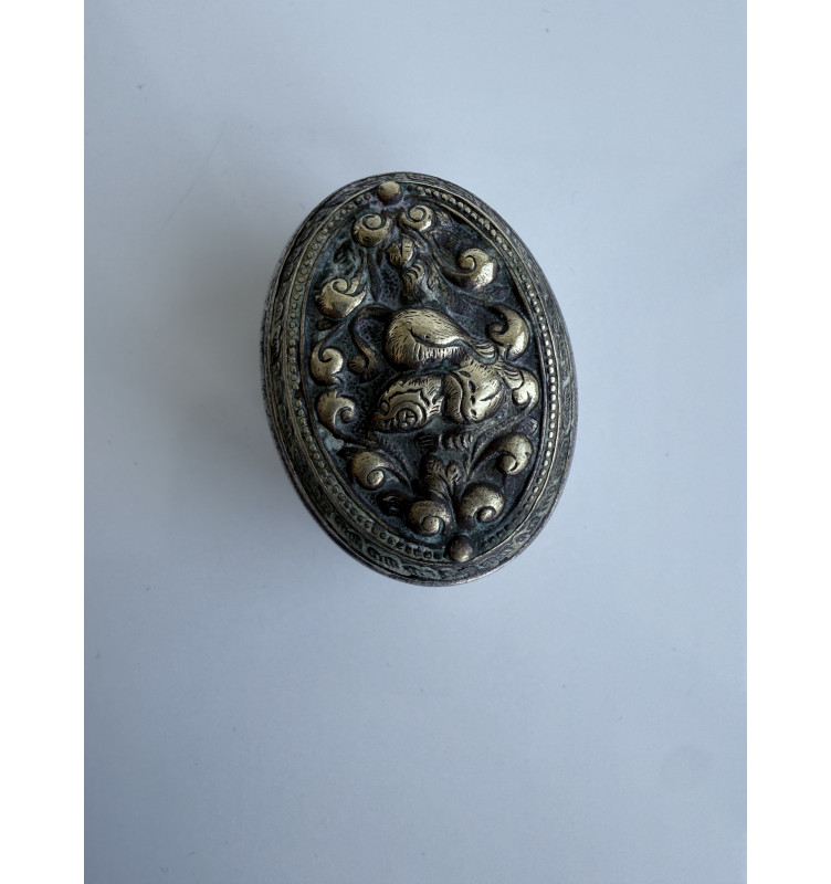 Kleine ovale Silberdose mit einem Löwenhund auf dem Deckel. Der Deckel ist eine Mischung aus Silber und Kupfer/Bronze. Glatte Seiten. Buchstaben und Zahlen sind in die Unterseite der Dose eingraviert. Gewicht 38 Gramm.