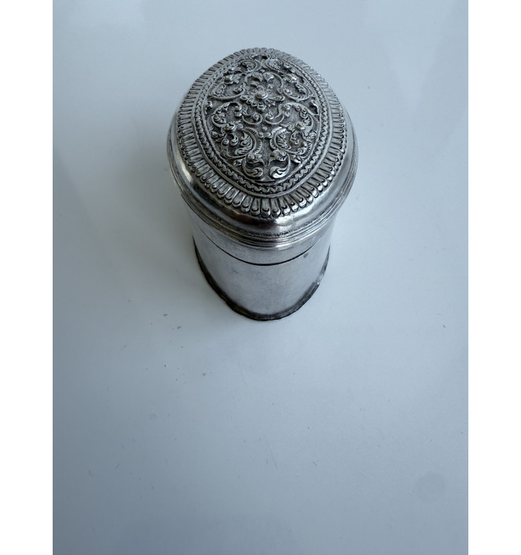Ovale Silber-Limettenbox mit einem sehr schönen symmetrischen Blumenmuster oben. Normalerweise ist der Deckel konvex, aber dieser Deckel ist flach. Leere Seiten und einige Markierungen sind in die Unterseite der Box eingraviert. In gutem Zustand. Gewicht 63 Gramm.