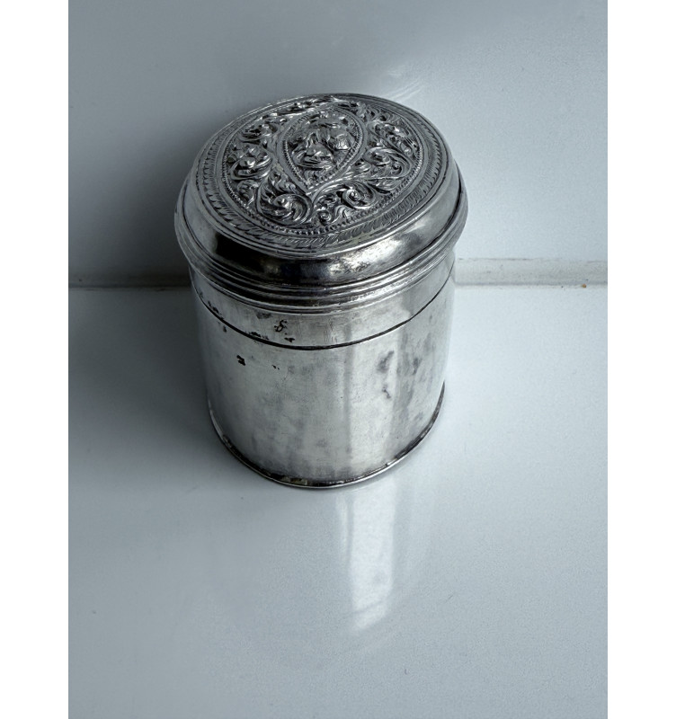 Ovale silberne Limettenbox mit einem sehr schönen symmetrischen Blumenmuster oben, umgeben von einem Löwenhund. Normalerweise ist der Deckel konvex, aber dieser Deckel ist flach. Leere Seiten. In gutem Zustand. Gewicht 86 Gramm.