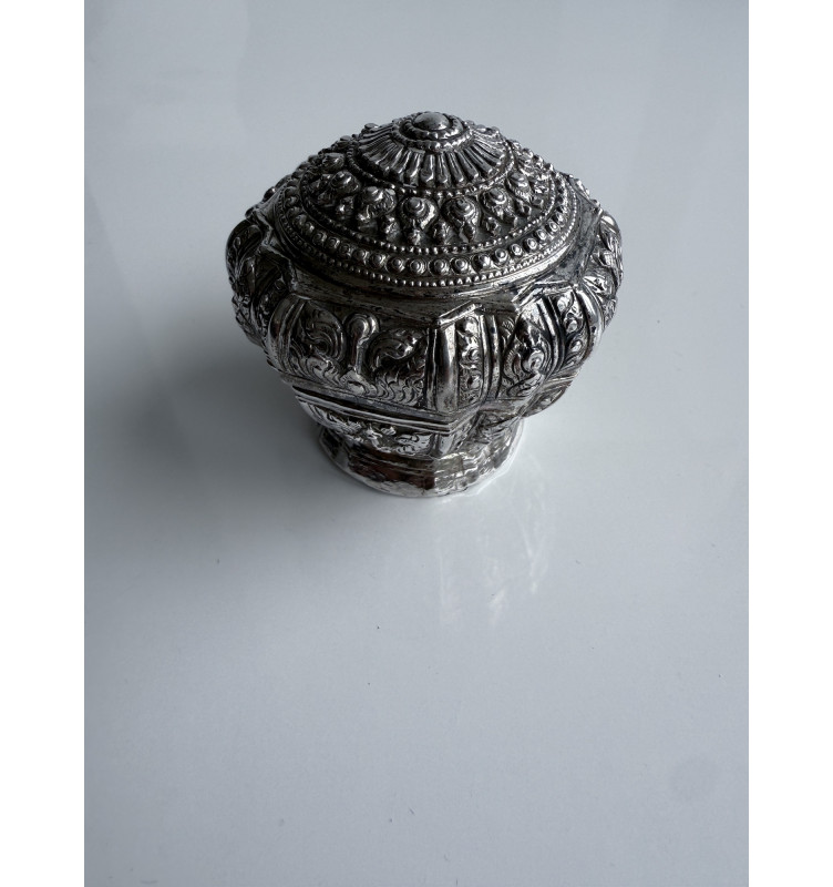 Runde silberne Dose, die überall mit verschiedenen Mustern verziert ist, auch am Boden. Gewicht 40 Gramm.