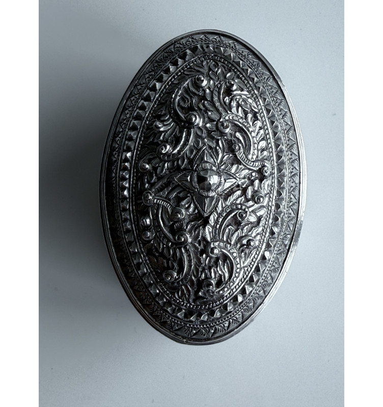 Größere ovale silberne Limettenbox mit einem schönen Blumenmuster auf dem Deckel. Glatte Seiten und eine fast unsichtbare Inschrift auf der Unterseite der Box eingraviert. in sehr gutem Zustand. Gewicht 130 Gramm.