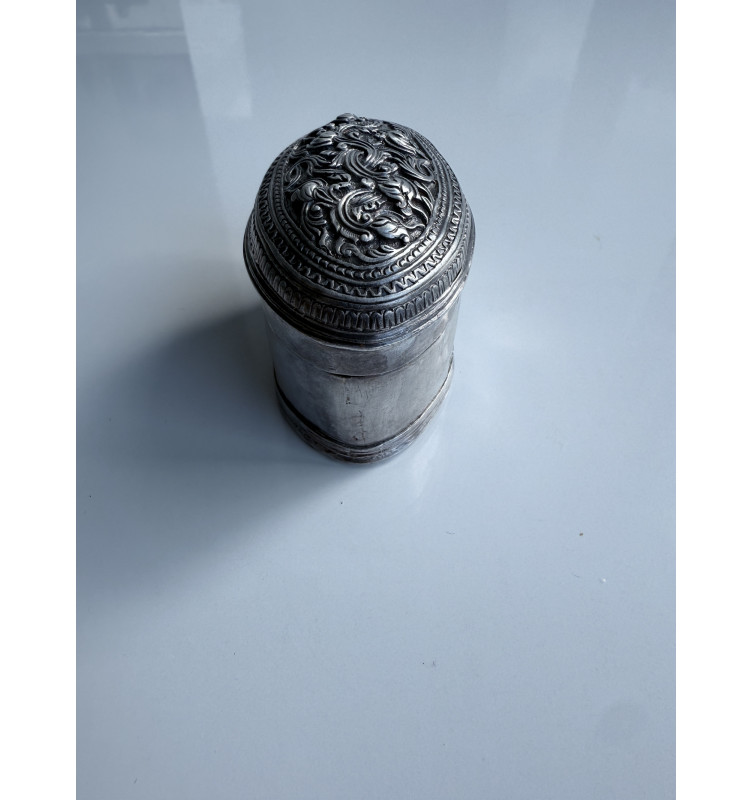 Kleinere ovale Silber-Limettenbox mit einem Hochrelief-Blumenmuster auf dem Deckel. Glatte Seiten und Boden. Ein starkes Band trennt den Deckel und endet die Box. Gewicht 73 Gramm.