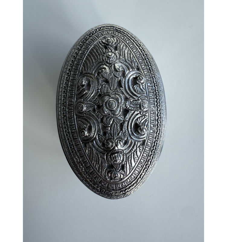 Kleinere ovale silberne Limettenbox mit feinem Blumenmuster auf dem Deckel. Glatte Seiten und Boden. Gewicht 65 Gramm.