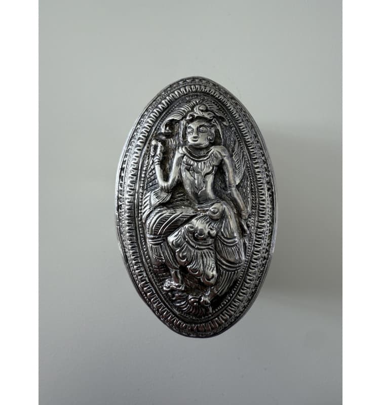 Solide, schlichte Silber-Limettenbox mit einer Person auf dem Deckel. Schlichte Seiten mit einer Inschrift auf der Unterseite der Box. Gewicht 87 Gramm.