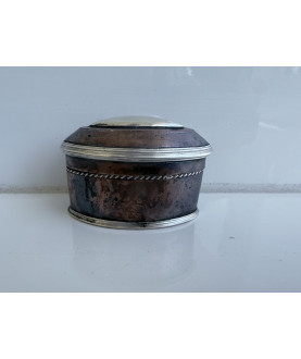 1.500,00 krUngewöhnliche, seltene und schöne Limettenbox aus Kupfer mit Silbereinlage. Reste von Limette in der Box. Wirklich eine hochwertige Box. Gewicht 122 Gramm. In sehr gutem Zustand.